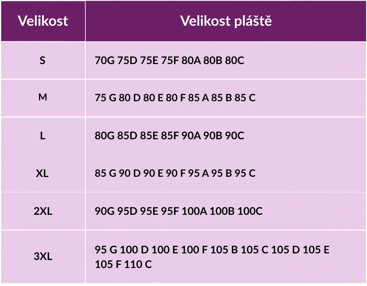 | 3XL | 95G 100D 100E 100F 105B 105C 105D 105E 105F 110C |